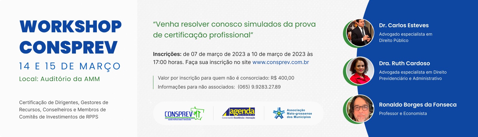 Workshop CONSPREV para certificação de Dirigentes, Gestores de Recursos,Conselheiros e Membros de Comitês de Investimentos de RPPS.As inscrições começam dia 07 de março de 2023 e vão até o dia 10 de março de 2023.